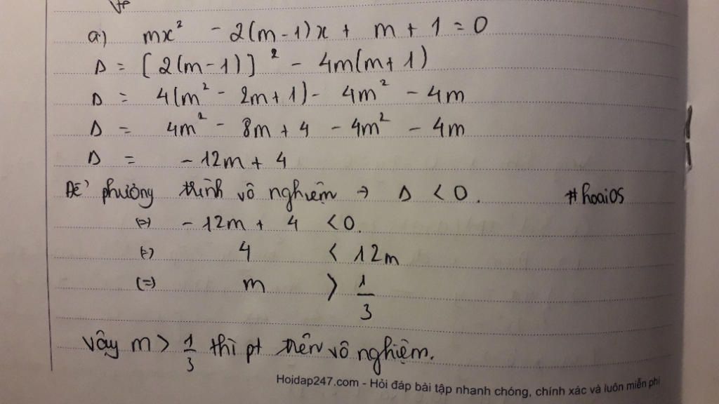 Vậy khi `m>1/3` thì phương trình `(1)` vô nghiệm.