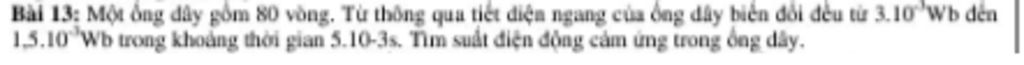 \(\xi = \dfrac{{N\Delta \Phi }}{{\Delta t}} = \dfrac{{80.\left( {{{3.10}^{ - 3}} - 1,{{5.10}^{ - 3}}} \right)}}{{{{5.10}^{ - 3}}}} = 24V\)