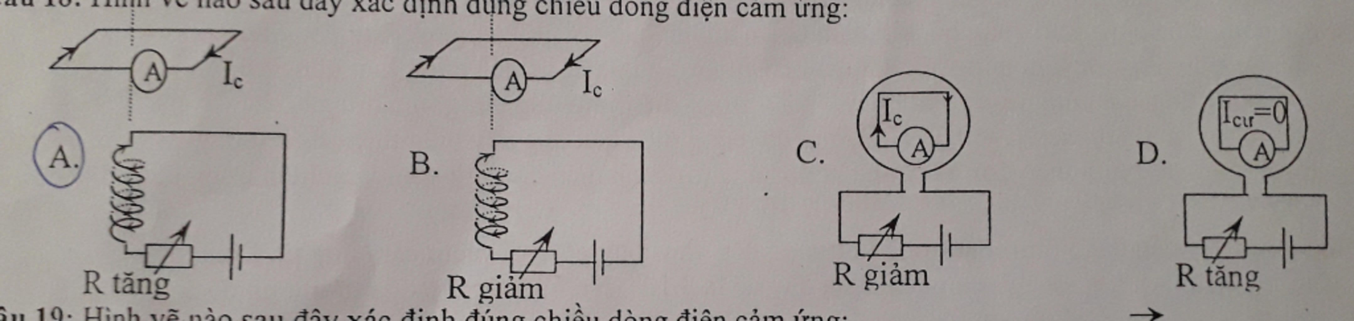 Do R tăng nên dòng điện trong mạch giảm, từ thông qua khung dây giảm nên chiều dòng điện cảm ứng cùng chiều dòng diện quy ước.