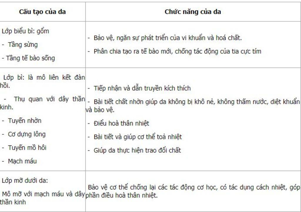 + Tầng tế bào sống: Tạo ra các tb mới thay thế cho tầng sừng bong ra, tạo màu sắc cho da, bảo vệ cơ thể khỏi tia cực tím-Lớp bì + Các thụ quan: Tiếp nhận kích thích của môi trường + Tuyến mồ hôi, tuyến nhờn, mạch máu, lông và cơ co chân lông: Điều hòa thân nhiệt và bài tiết-Lớp mỡ dưới da + Lớp mỡ: Dự trữ mỡ, chống tác động cơ học, góp phần điều hòa thân nh