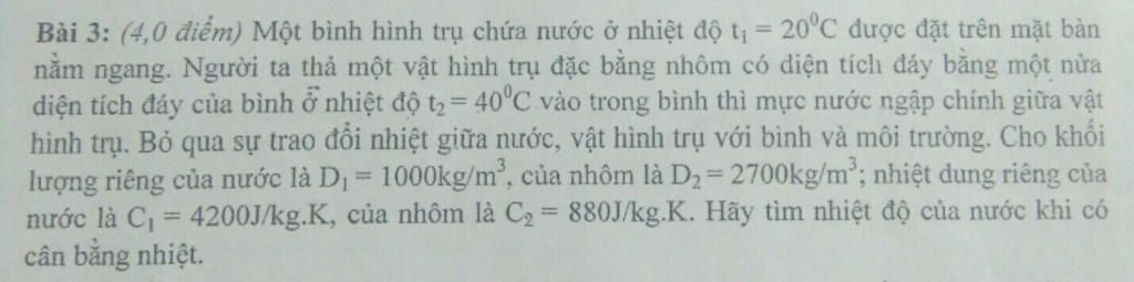 Bài 3: (4,0 điểm) Một bình hình trụ chứa nước ở nhiệt độ t = 20°C dưoc đặt trên mặt bàn