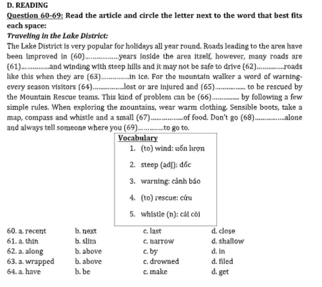 Question 60-69: Read the article and circle the letter next to the word that best fits