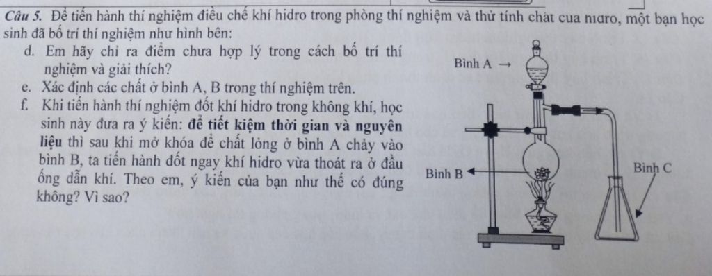 Ý kiến đó là sai. Khí $H_2$ mới bay ra còn lẫn không khí có trong các bình $A$, $B$, ống dẫn nên nếu đốt ngay, $H_2$ sẽ nổ mạnh, gây nguy hiểm và làm vỡ bình thí nghiệm.