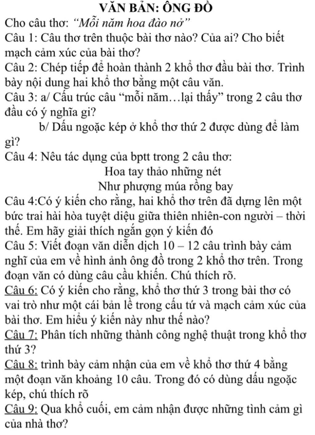 Hai từ “mỗi” điệp lại trong một câu thơ diễn tả bước đi cảu thời gian.Nếu như trước đây : “Mỗi năm hoa đào nở” lại đưa đến cho ông đồ già “bao nhiêu người thuê viết” thì giờ đây “mỗi năm” lại “mỗi vắng”. Nhịp đi của thời gian bao hàm cả sự mài mòn, suy thoái.Thanh “sắc” kết hợp với âm “ắng” khép lại câu thứ nhất như một sự hẫng hụt, chênh chao, như đôi mắt nhìn lên đầy băn khoăn. Để rồi một cách tự nhiên, câu thứ hai phải bật ra thành câu hỏi: Những người thuê ông đồ viết chữ khi xưa nay đâu cả rồi? Câu hỏi buông ra không bao giờ có lời đáp nên cứ chạp chớn, cứ ám ảnh mãi. Người thuê viết không còn, giấy đỏ, mực thơm không được dùng đến nên: