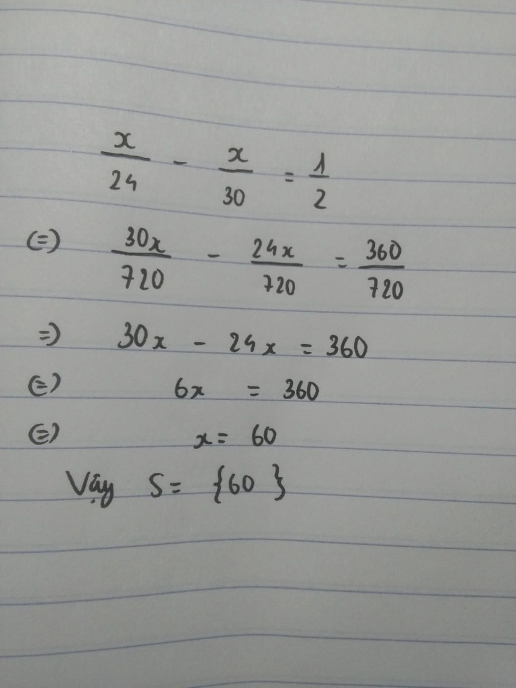 `x/24 -x/30 =1/2`(ĐKXĐ:`x`$\neq$ `24`,`x`$\neq$ `30`)