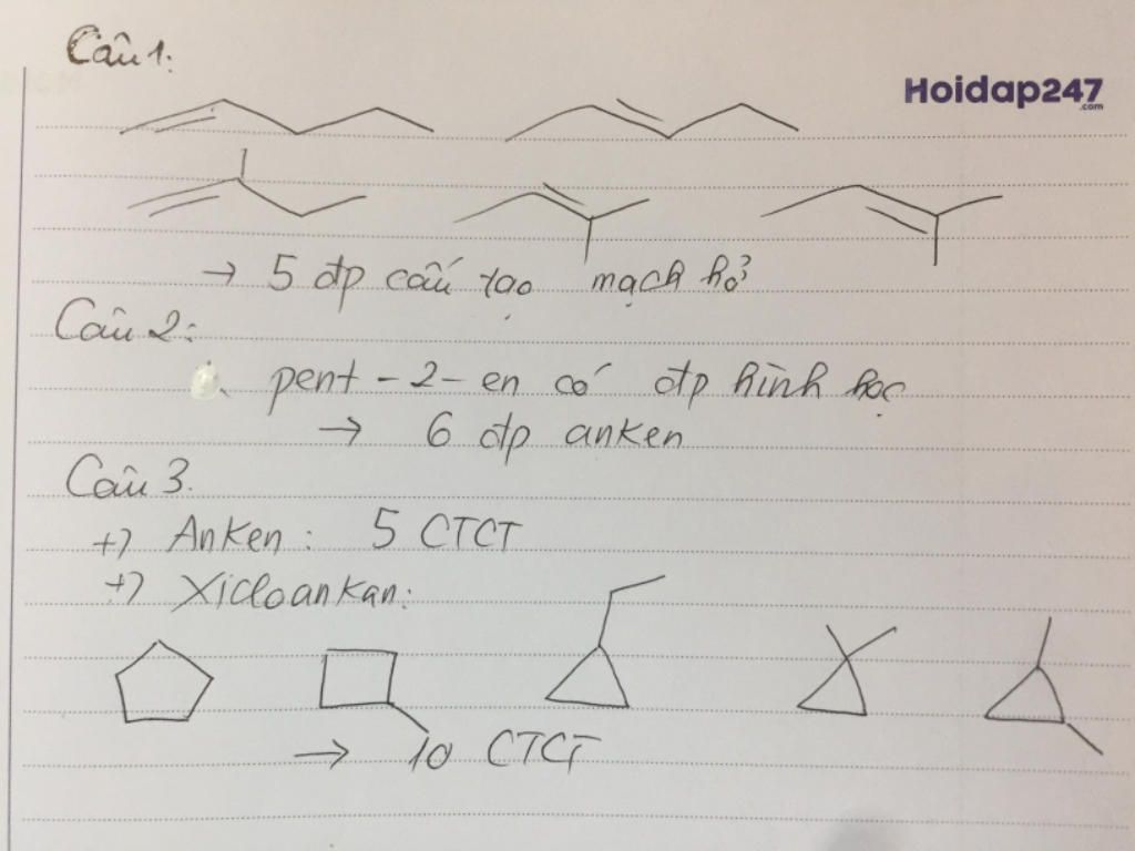 + Câu 1: mạch hở $\to$ đồng phân anken, tìm đồng phân cấu tạo $\to$ không đếm đồng phân hình học