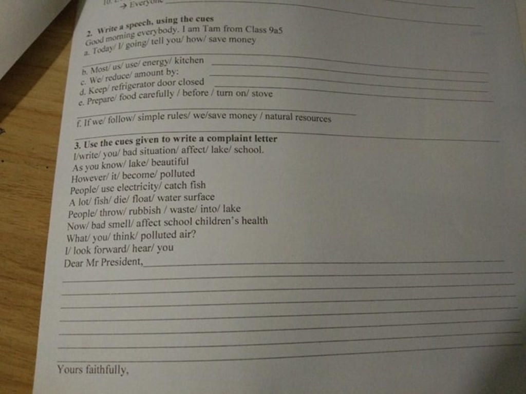 I’m writing to you about bad situation, which is affecting the lake near my school. As you know, the lake near my school is very beautiful. However, it has become polluted. People have used electricity to catch fish. A lot of fish died and floated on the water surface. People have thrown rubbish and waste into the lake. Now, bad smell is affecting my school children ‘s health. What do you think about this polluted air? I’m looking forward to hearing from you.