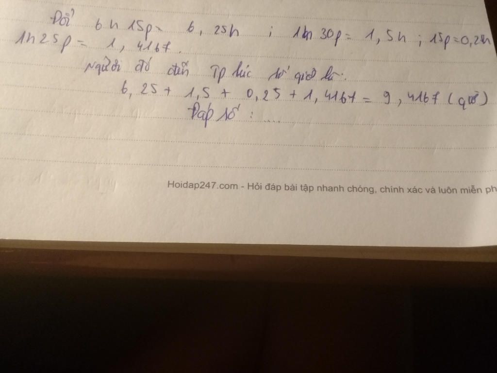 6 giờ 15 phút + 1 giờ 30 + 15 phút + 1 giờ 25 phút = 9 giờ 25 phút