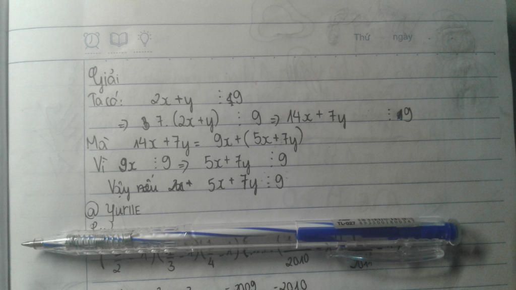 mà chỗ kết luôn thì thiếu phải là vậy khi 2x.y chia hết cho 9 thì 5x+7y chia hết cho 9 chứ sao lại chỉ viết 5x+7y chia hết cho 9