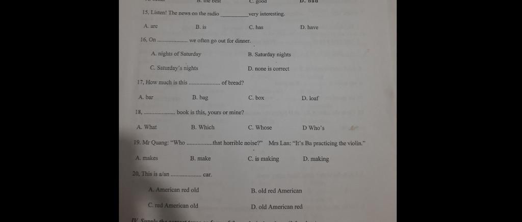thứ tự tính từ: opinion - size - age - color - origin - material - purpose