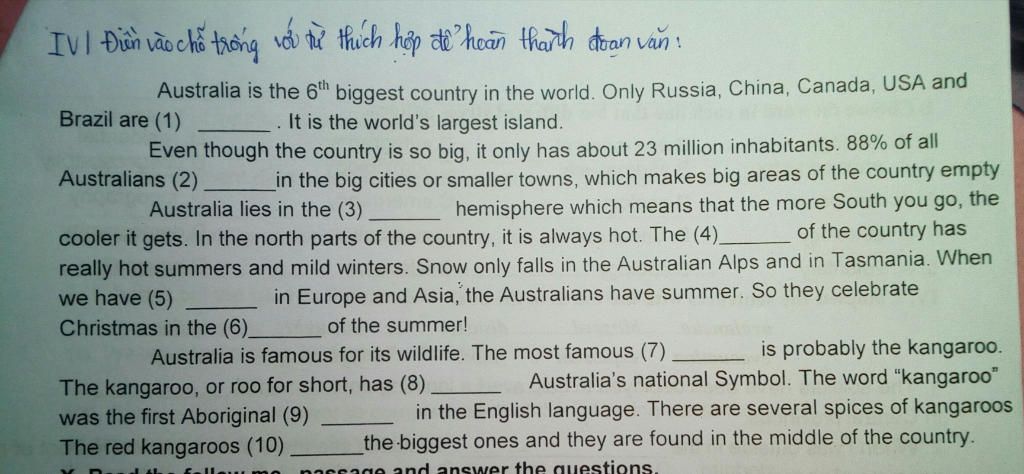 Australia is famous for its wildlife. The most famous (7) _animal_____ is probably the kangaroo. The kangaroo, or roo for short, has (8) _been_____ Australia’s national Symbol. The word “kangaroo” was the first Aboriginal (9) __Word____ in the English language. There are several spices of kangaroos. The red kangaroos (10) _are_____the biggest ones and they are found in the middle of the country.