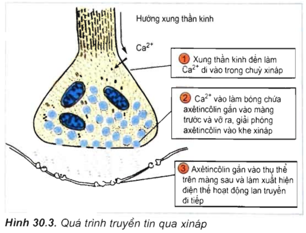 Bước 1: Xung thần kinh lan truyền đến chùy xinap → tính thấm của màng chùy xinap biến đổi làm mở kênh Ca2+ = Ca2+ từ dịch ngoại bào đi vào trong chùy xinap.
