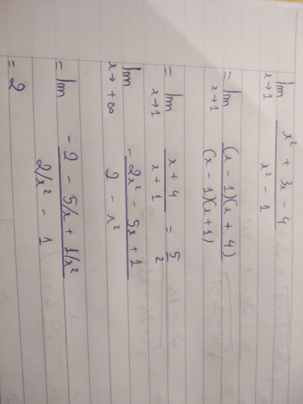 1)\mathop {\lim }\limits_{x \to 1} \dfrac{{{x^2} + 3x - 4}}{{{x^2} - 1}} = \mathop {\lim }\limits_{x \to 1} \dfrac{{\left( {x + 4} \right)\left( {x - 1} \right)}}{{\left( {x - 1} \right)\left( {x + 1} \right)}}\\