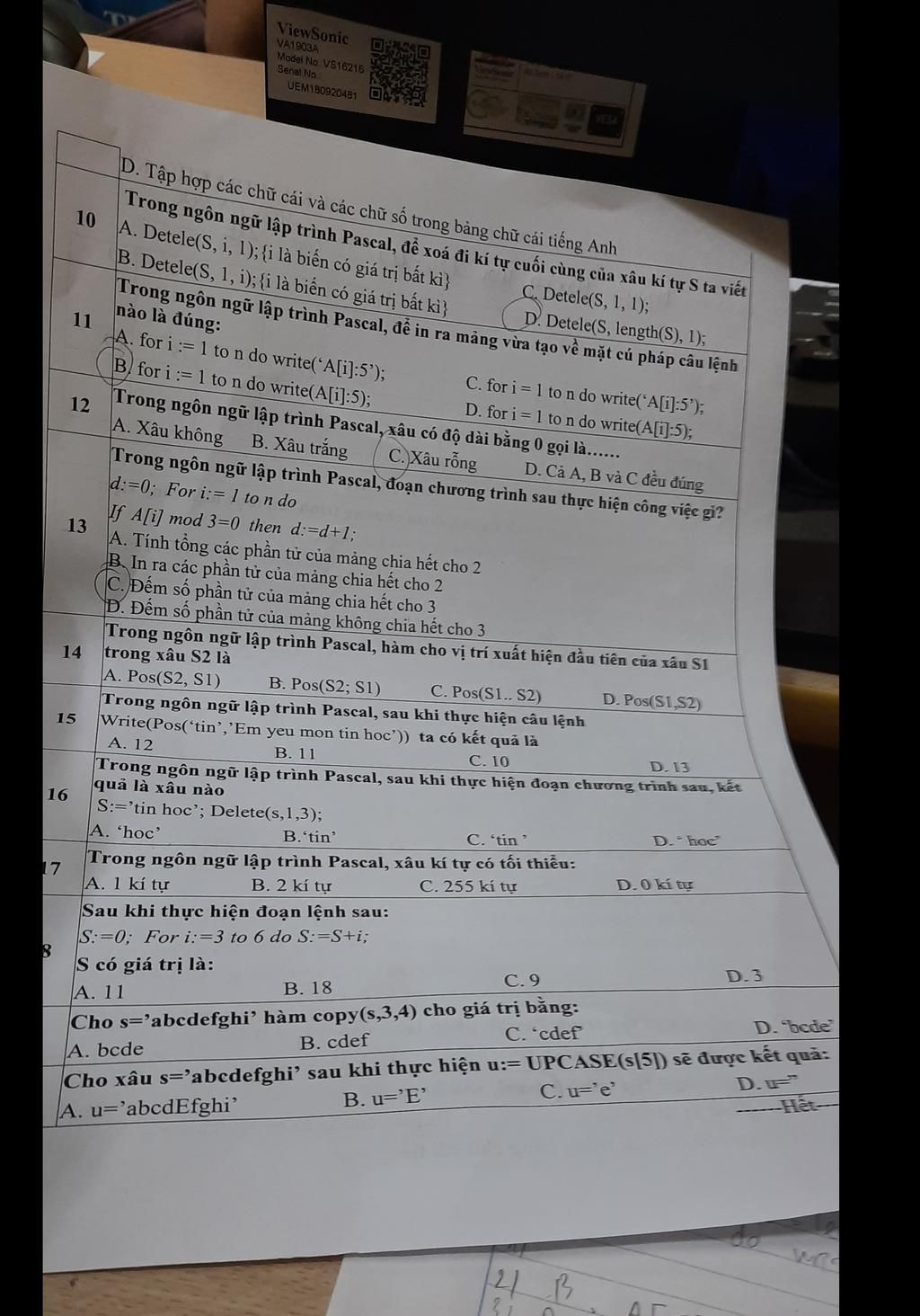 Trong ngôn ngữ lập trình Pascal, để xoá đi kí tự cuối cùng của xâu kí tự S ta viết