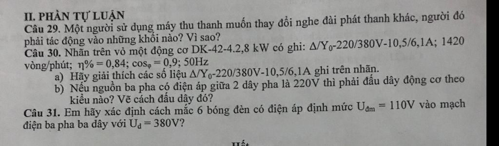 Câu 31: Cách mắc `6` bóng đèn có điện áp định mức `U_(đm)=110V` vào mạch điện ba pha ba dây với `U_d=380V`: Mắc nối tiếp mỗi `2` bóng thành một cụm, các cụm nối hình sao.