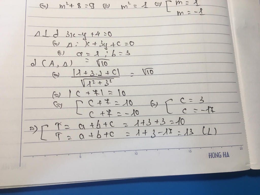 $\Leftrightarrow\sqrt{10}=\dfrac{|1.1+3.2+c|}{\sqrt{10}}$