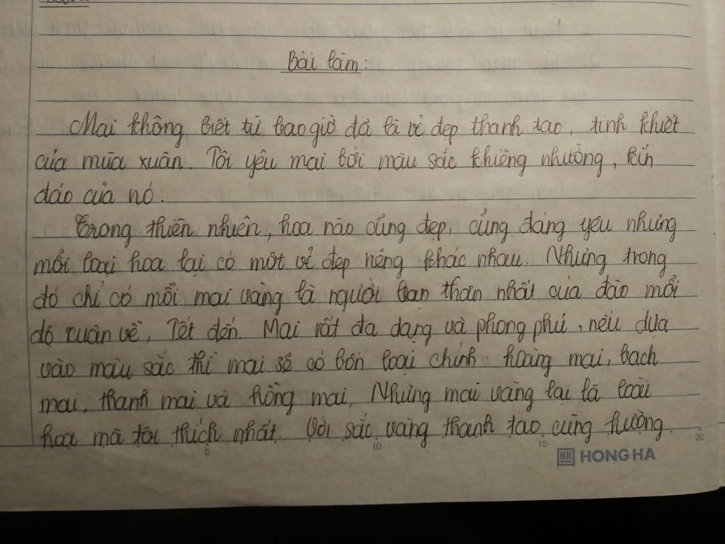 Hoa mai đứng đầu trong bộ tứ bình, là sức sống, là cái hồn của mùa xuân Việt Nam. Đến cận kề ngày xuân, ra phố nhìn thấy cánh mai vàng, sắc vàng của hoa mai là không khí Tết đã rộn ràng lan tỏa đến mọi nhà. Từng chùm, từng chùm mai mọc quấn quýt lấy nhau tạo một tổng thể trang nhã, rực rỡ. Màu vàng hoàng tộc của hoa mai đã khiến cho nó mag một vẻ đẹp quyền quý cao sang. Hoa mai có hương thơm thoang thoảng, nhẹ nhàng, kín đáo, xoa dịu lòng người. Vì thế mà không chỉ có tác dụng trạng trí trong nhà đặc biệt là các dịp lễ tết, hoa mai còn là một món quà vô cùng ý nghĩa tặng người thân, bạn bè nhân dịp đầu năm mới. Ngày xuân sum họp, mọi người quây quần bên nhau, con cháu xa quê về thăm ông bà cha mẹ không quên mang một cành mai về làm quà cho gia đình. Những lời chúc tốt đẹp cho năm mới sẽ ý nghĩa hơn, trọn vẹn hơn khi có bóng dáng hoa mai làm điểm nhấn. Hoa mai không chỉ có giá trị thẩm mĩ cao mà còn mang giá trị tinh thần sâu sắc của người Việt. Nguyễn Du đã lấy hình ảnh cây mai làm thước đo của sắc đẹp khi miêu tả vẻ đẹp cả hai chi em Thúy Vân Thúy Kiều: "Mai cốt cách tuyết tinh thần". Mang vẻ đẹp thanh khiết và tao nhã, mai đã trở thành biểu tượng đẹp trong mắt con người. Sắc mai vàng rực rỡ đón nắng luôn là hình ảnh khó phai trong lòng mỗi người dân đất Việt.