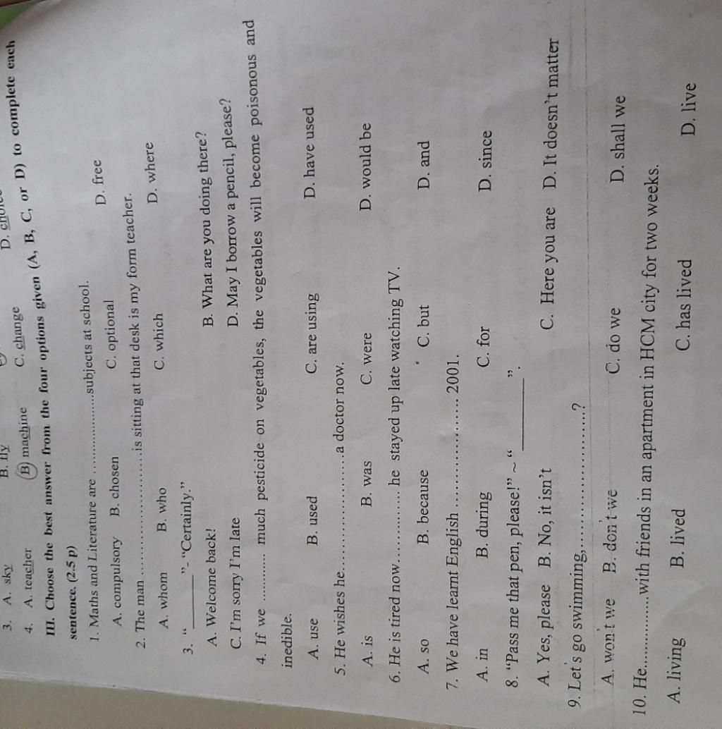 II. Choose the best answer from the four options given (A, B, C, or D) to complete each