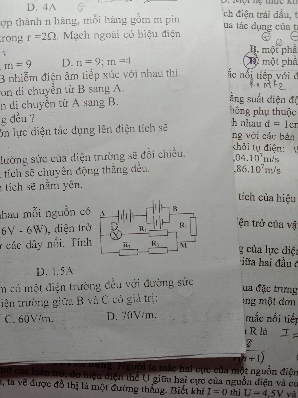 \Rightarrow I = {I_1} = \frac{E}{{{R_{TD}} + r}} = \frac{{15}}{{9 + 1}} = 1,5(A)
