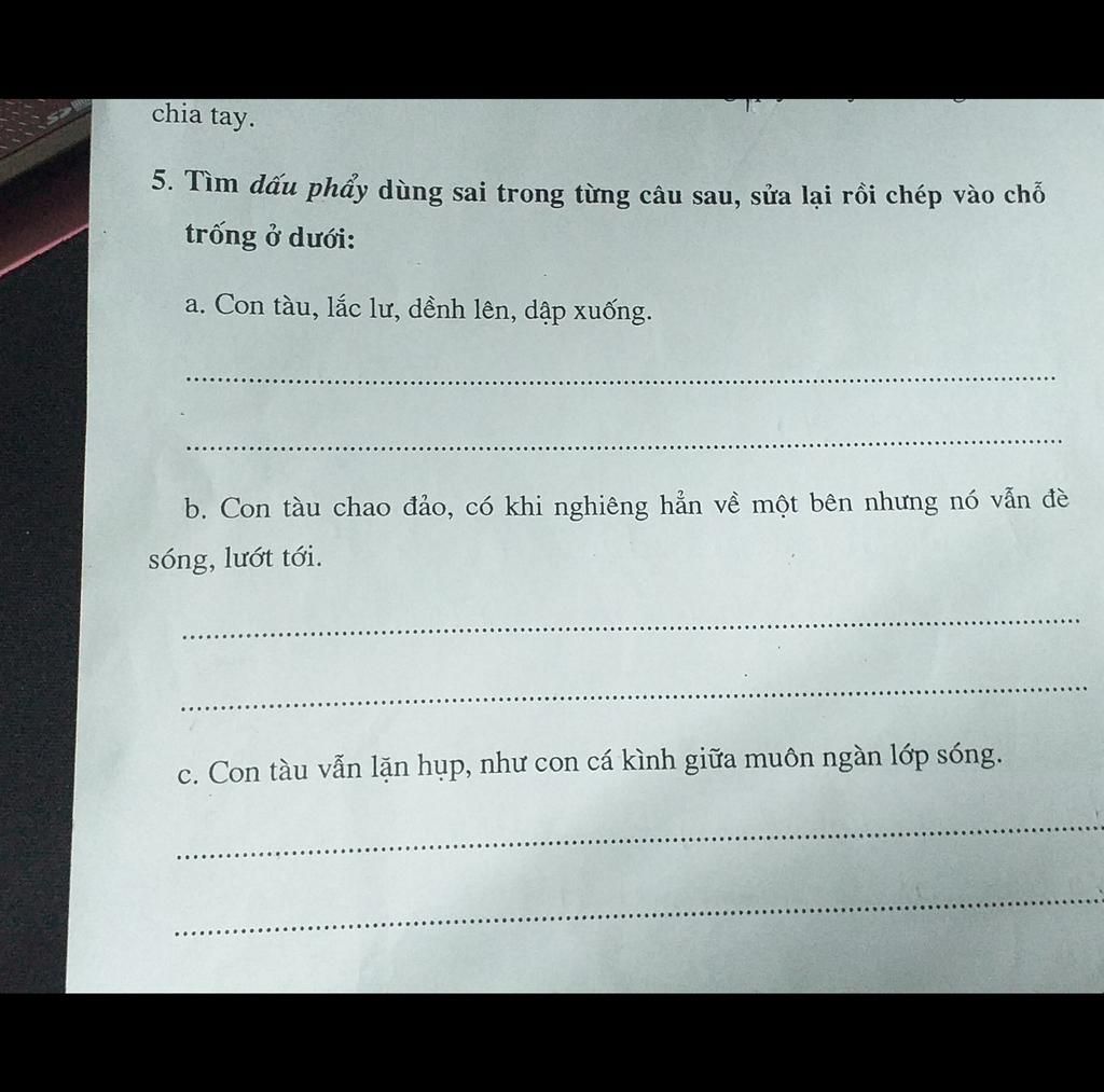 Dấu phẩy sai trong câu: Con tàu ,lắc lư, dềnh lên, dập xuống.