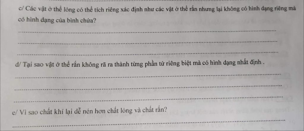 c, Lực tương tác phân tử ở thể lỏng lớn hơn ở thể khí nên giữ được các phân tử không chuyển động phân tán ra xa nhau, làm cho chất lỏng có thể tích xác định. Tuy nhiên lực này chưa đủ lớn như trong chất rắn để giữ các phân tử ở những vị trí cân bằng xác định. Các phân tử trong chất lỏng dao động xung quanh các vị trí cân bằng không cố định mà di chuyển được nên chất lỏng không có hình dạng riêng mà có hình dạng của phần bình chứa nó.