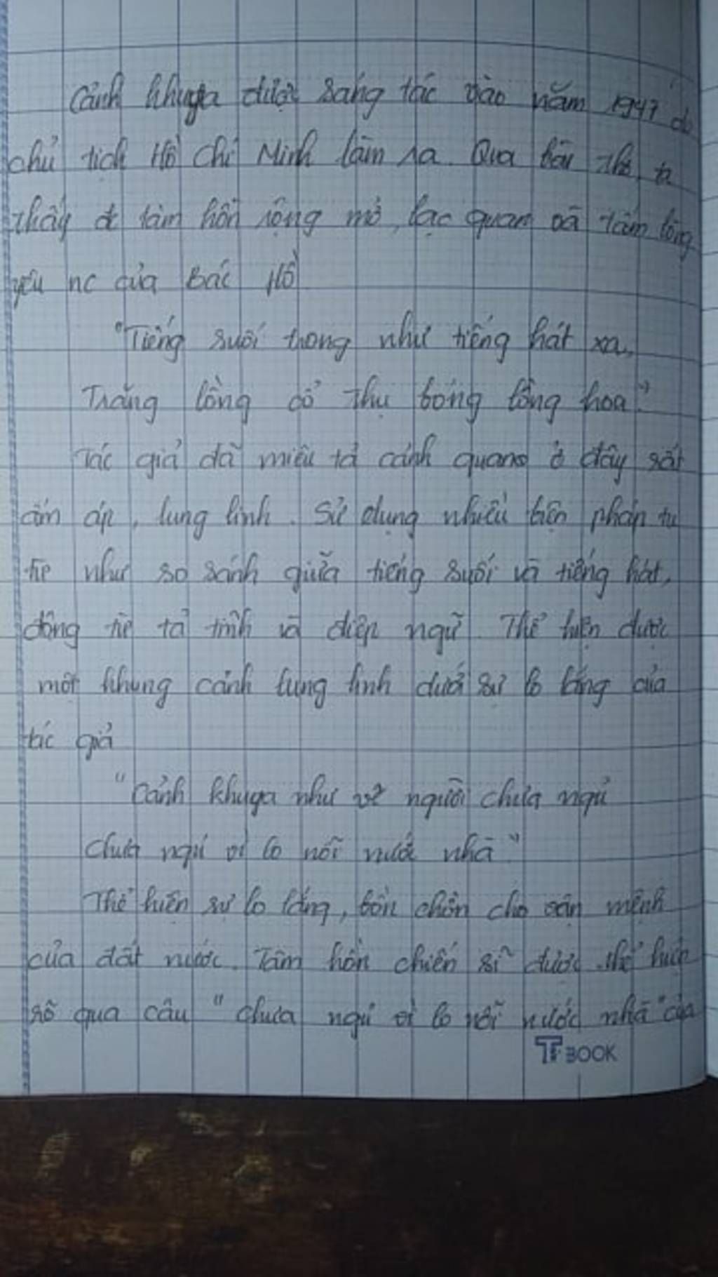 Trong khung cảnh tính vắng và yên tĩnh đến lạ thường,trong lòng bác có muôn vàn cảm xúc ngổn ngang trong tâm trí ,về cảnh đẹp về đát nước.Và qua đó càng làm cho em kính trọng,khâm phục và yêu quý bác - người cha già của dân tộc Việt Nam ta.Một người yêu thiên nhiên và yêu cả đất nước !à ngòi bút của em không thể diễn tả hết bằng lời