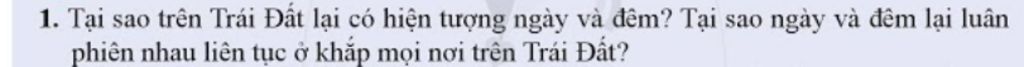 - Trái Đất có dạng hình cầu, do đó Mặt Trời bao giờ cũng chỉ chiếu sáng một nửa. Nửa được chiếu sáng là ngày, nửa nằm trong bóng tối là đêm.