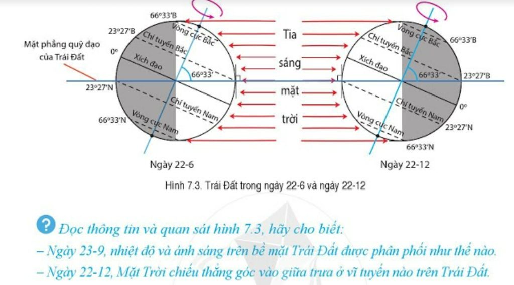 Ngày 22/12, Mặt Trời chiếu thẳng góc vào giữa trưa ở vĩ tuyến 23 độ 27'B trên Trái Đất.
