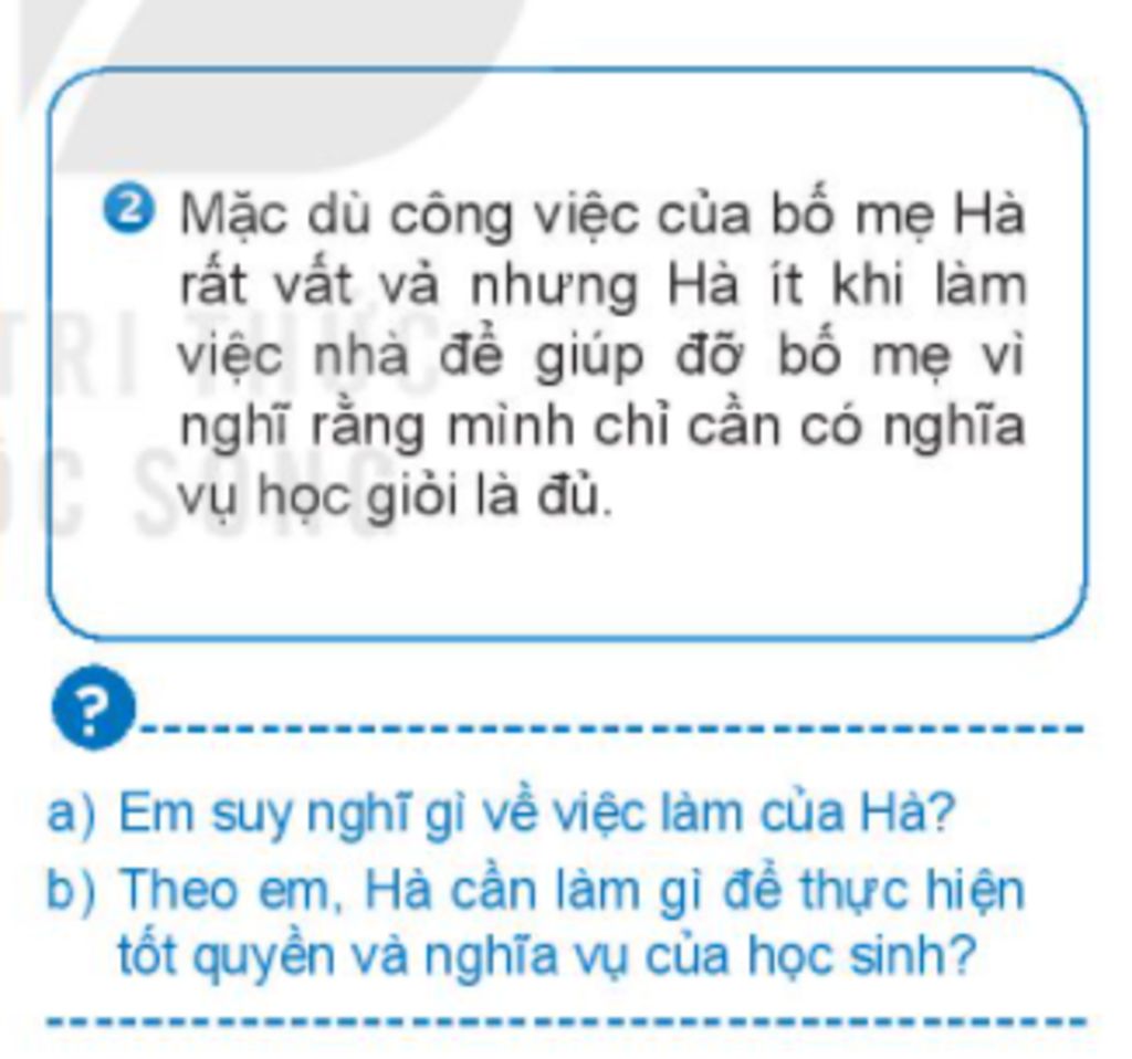 b) Theo em Hà không chỉ cần cố gắng học tập . Cần phụ giúp bố mẹ làm những công việc nhà để thực hiện tốt quyền và nghĩa vụ của học sinh