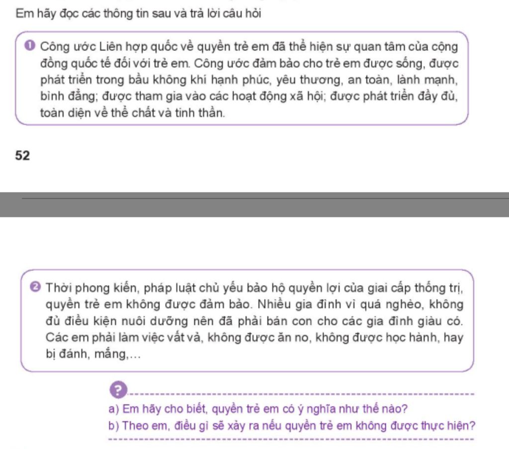 b) Nếu quyền trẻ em không được thực hiện, trẻ em sẽ bị đối xử rất bất công. Các em sẽ không được hưởng những quyền lợi như: