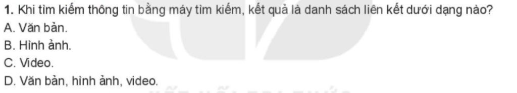 Kết quả tìm kiếm thông tin bằng máy tím kiếm là danh sách liên kết dưới dạng văn bản, video, hình ảnh,...