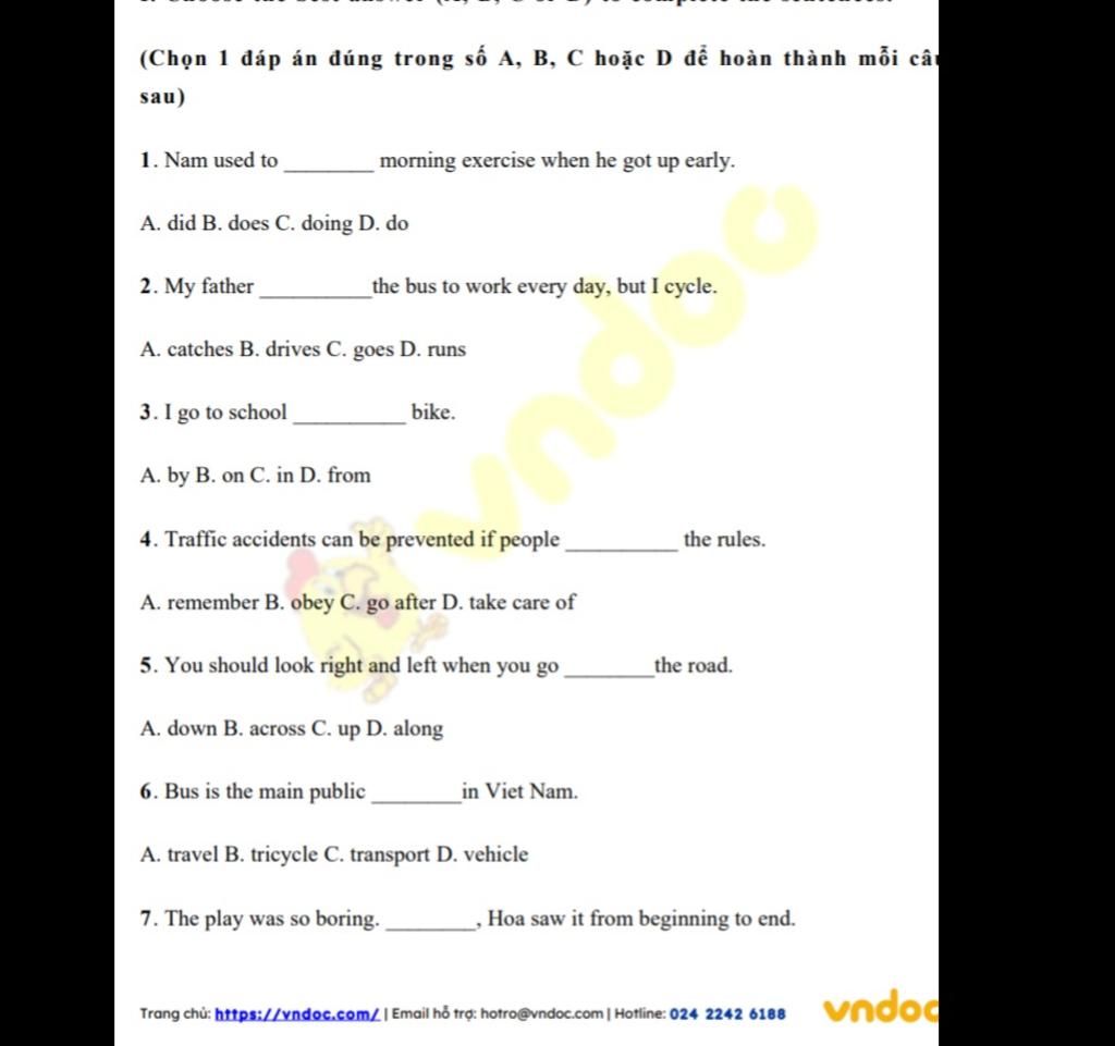 3 A by ( by bike: bằng xe đạp. Phương tiện nên dùng by )