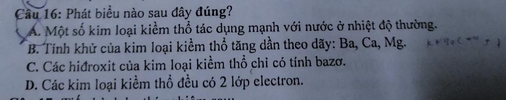 Các kim loại kiềm thổ có `2e` lớp ngoài cùng còn số lớp thì tăng dần