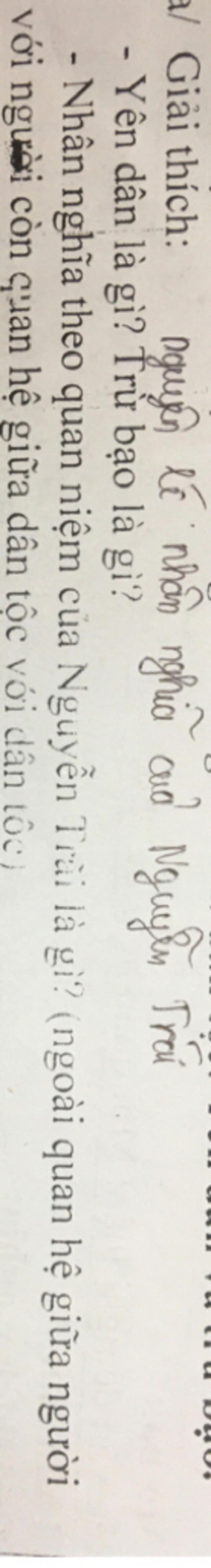 Nguyên lí nhân nghĩa do Nguyễn Trãi đặt ra là "trừ bạo" , "yên dân" vì nguyên lí của Nguyễn Trãi xuất phát từ lòng yêu nước,yêu dân.