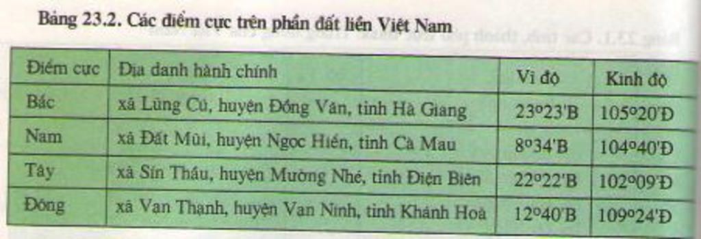 - Nam: xã Đất Mũi, huyện Ngọc Hiển, tỉnh Cà Mau
