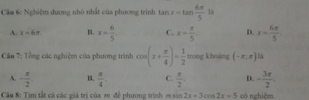 \tan x = \tan \frac{{6\pi }}{5} < = > x = \frac{{6\pi }}{5} + k\pi > 0 = > k\pi > \frac{{ - 6\pi }}{5} = > k > \frac{{ - 6}}{5}\\