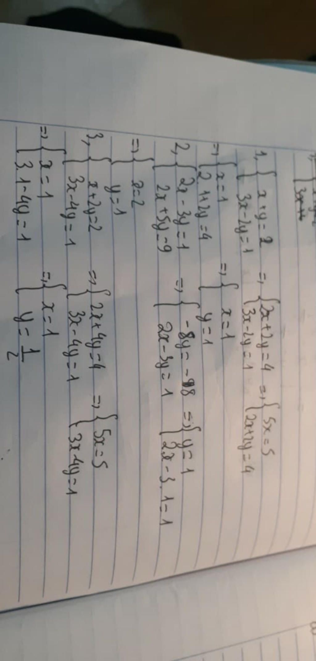 $\text{⇔ $\left \{ {{2x+2y=4} \atop {3x-2y=1}} \right.$ }$