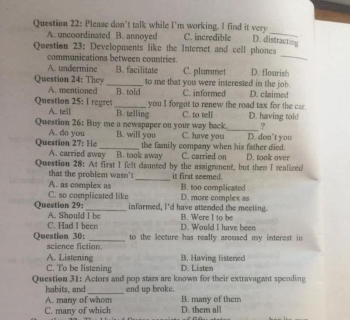 - uncoordinated: vô tổ chức/ incredible: đáng king ngạc/ annoyed: bực mình