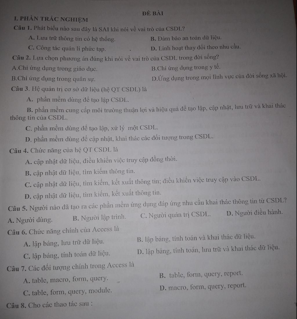 Câu 1. Phát biểu nào sau đây là SAI khi nói về vai trò của CSDL?