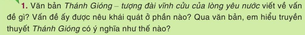 Văn bản Thánh Gióng- tượng đài vĩnh cửu của lòng yêu nước viết về truyền thuyết của vị tráng sĩ, thiên tướng Phù Đổng Thiên Vương đánh đuổi giặc Ân, bảo vệ nền hòa bình của nước nhà. Vấn đề ấy được nêu khái quát ở phần 4. Qua văn bản, em hiểu truyền thuyết Thánh Gióng có ý nghĩa gửi gắm ước mơ của nhân dân ta về truyền thống chống giặc ngoại xâm oanh liệt, gửi gắm ước mơ về sức khỏe vô địch vô song chiến thắng mọi thế lực thù địch xâm phạm bờ cõi của ông cha ta.