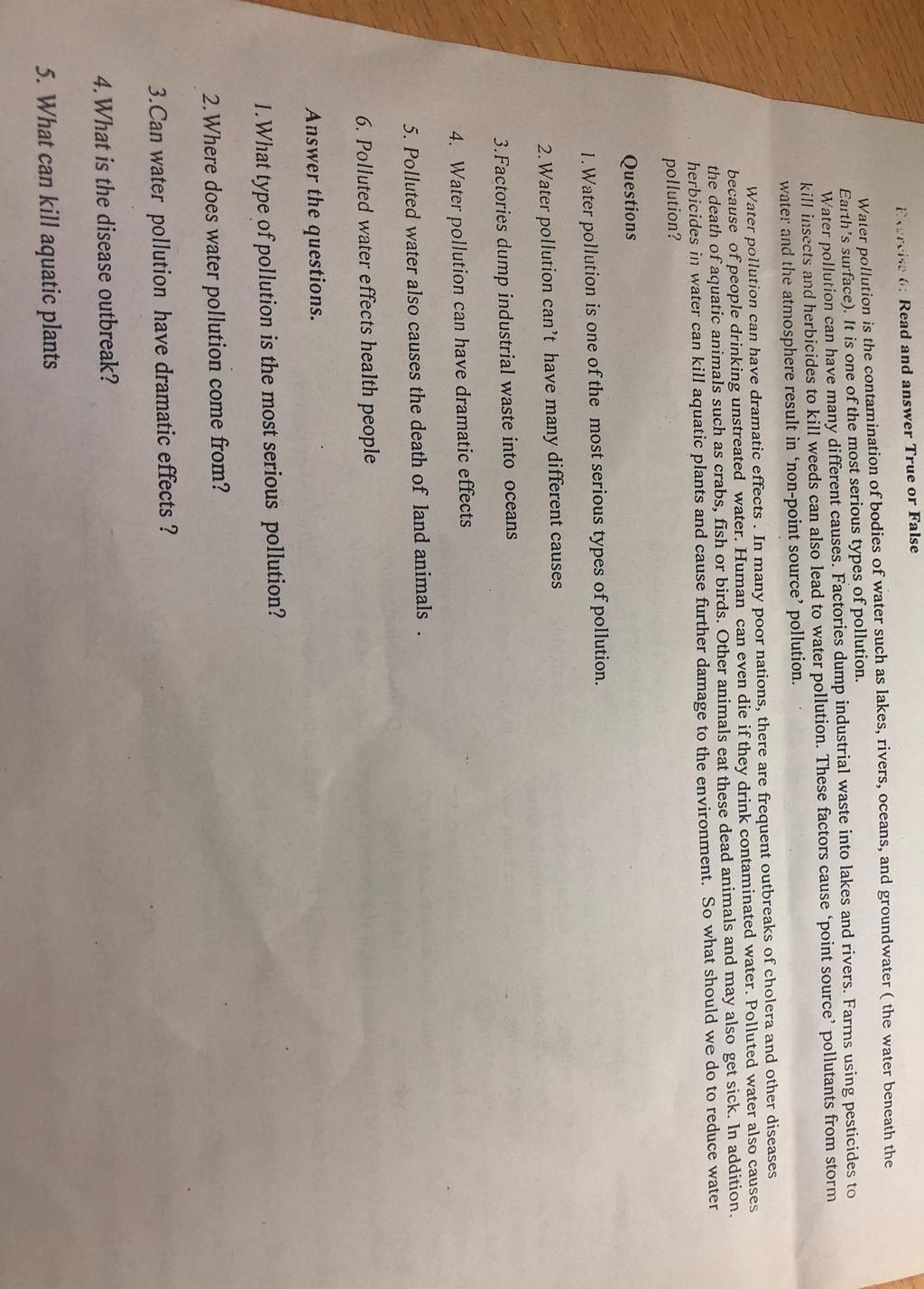I.1T,2F,3F,4T,5F,6T II.1.Water pollution. 2.It comes from the contamination of bodies of water such as lakes,rivers,oceans,underground water(the water beneath the Earth's surface). 3.Yes,it can. 4.In many poor nations,there are frequent outbreaks of cholera and other diseases because of people drinking unstreated water. 5.herbieides in water