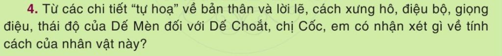 Dế Mèn là một chú dế có tính cách rất tự tin. Chú biết tự hào về cái đẹp của mình và hãnh diện vì vẻ đẹp của bản thân. Nhưng đồng thời, ở Mèn cũng có nét tính cách chưa tốt như kiêu căng, xốc nổi, coi thường, bắt nạt người khác và nhất là những người yêu thế hơn mình.