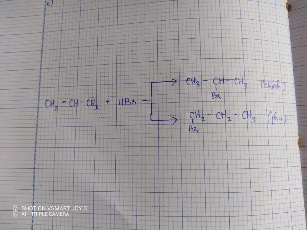 \(C{H_2} = CH - C{H_3} + HBr\xrightarrow{{}}C{H_2}Br - C{H_2} - C{H_3}\) (sản phẩm phụ)