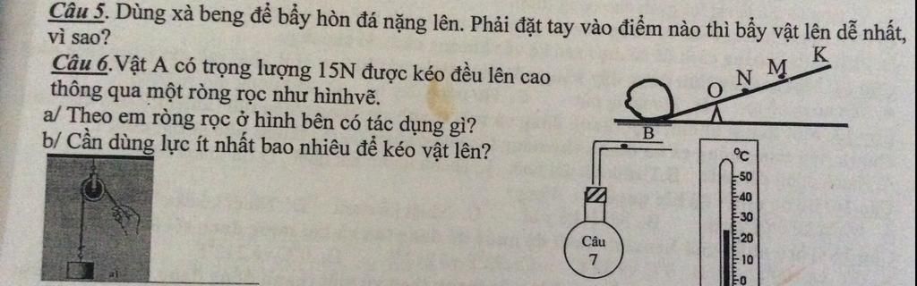 Câu 5. Dùng xà bên để bẩy hòn đá nặng lên cao. Xà beng đóng vai trò như đòn bẩy nên cánh tay đòn càng dài, lực tác dụng càng nhỏ nên đặt tay tại điểm K là dễ bẩy nhất.