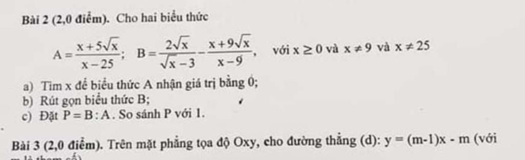 a.A = \frac{{x + 5\sqrt x }}{{x - 25}} = \frac{{\sqrt x (\sqrt x + 5)}}{{(\sqrt x - 5)(\sqrt x + 5)}} = \frac{{\sqrt x }}{{\sqrt x - 5}} = 0\\