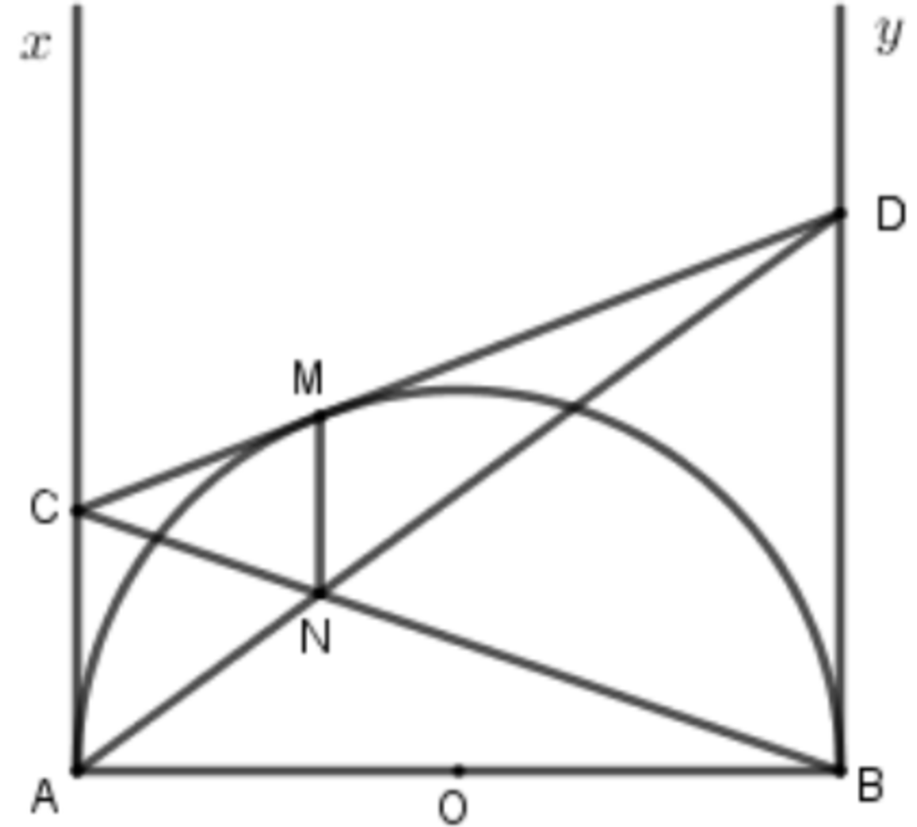 Xét nửa đường tròn tâm \(O,\) theo tính chất hai tiếp tuyến cắt nhau ta có: \(AC=MC, BD=MD\)