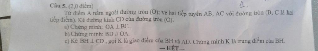 Đáp án: a, Ta có: AB, AC là tiếp tuyến của đường tròn(o)→ AB=AC