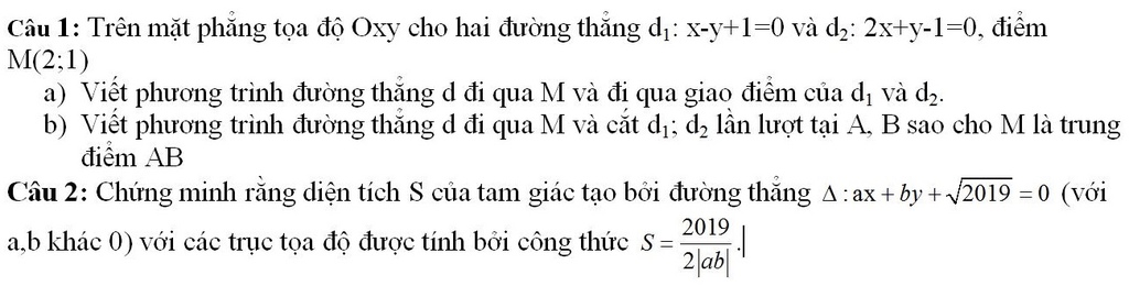 Đường thẳng \(\Delta \) tạo với 2 trục tọa độ chính là tam giác OAB vuông tại O, có diện tích là \(S = \dfrac{1}{2}OA.OB = \dfrac{1}{2}.\dfrac{{\sqrt {2019} }}{{\left| a \right|}}.\dfrac{{\sqrt {2019} }}{{\left| b \right|}} = \dfrac{{2019}}{{2\left| {ab} \right|}}\) (đpcm).
