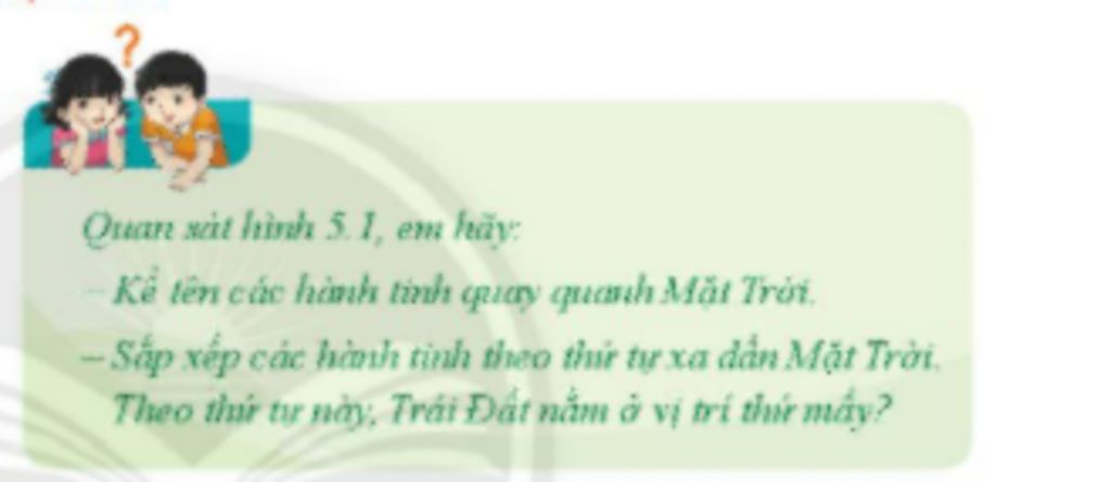 - Các hành tinh quay quanh Mặt Trời: thiên vương tinh, mộc tinh, hải vương tinh, thổ tinh, hỏa tinh, thủy tinh, kim tinh, Trái Đất.