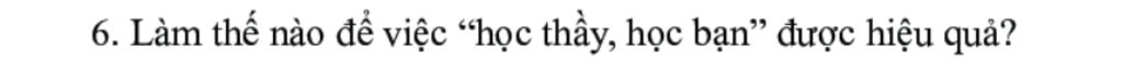 Để học thầy, học bạn một cách hiệu quả: phải biết lắng nghe ý kiến từ người khác chứ không nên bảo thủ quan điểm, phải ham học hỏi, cầu thị trong học tập, không ngại khó ngại khổ, không biếng nhác, không giấu đi cái mình chưa tốt, chưa hiểu.